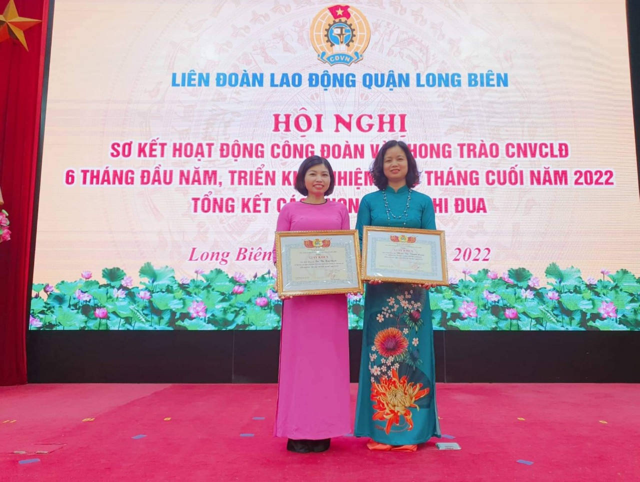 Cô giáo Bùi Thị Kim Oanh nhận giấy khen biểu dương “Gia đình CNVCLĐ tiêu biểu” Quận Long Biên năm 2022